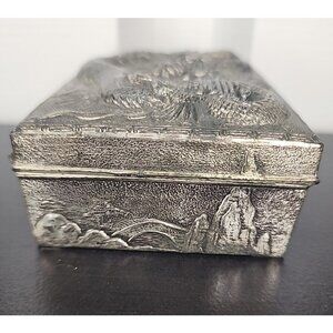 Has a dragon design on the lid and Mountains, Bridges and water on the sides of the box. Each of the 4 sides depict a different scene