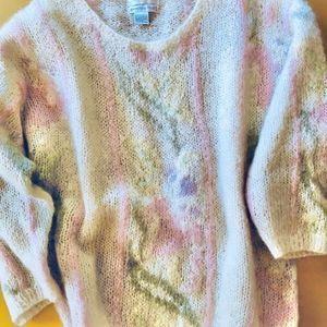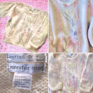 This gorgeous one of a kind 80/20 wool and acrylic sweater was knit by hand and is in perfect condition. The embellished design is so romantic and sweet. It’s a semi loose knit cream sweater with a subtle blush pink and pastel green floral pattern. Fuzzy and soft! Slightly oversized and slouchy fit.