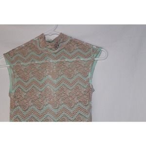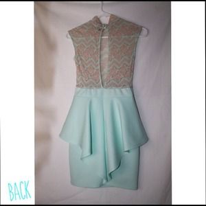 mint peplum dress // the bottom part is mint // the top part is lacy and it's like creme and mint // worn 4 times // there's like a huge pretty hole in the back which is part of the dress // it's see through // wear a bandeau with it or a tanktop // I really like this dress