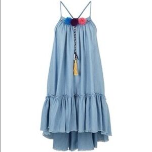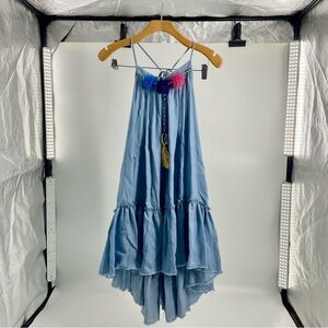 misa - dali dress sleeveless pom pom chambray loose oversized vacation fun tropical dress. Strappy high neck and tie back high low ruffle hem detail with manufactured fraying for distressed casual look. Only flaw is one small spot where one of the straps is coming loose. Easy to fix quickly and yourself.