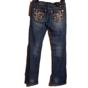 This is a great pair of Blingy Miss Mes! Size 29. Signals Bootcut. Plenty of big white stitching and bling. Slight distressing at hems, and whiskering also. And Very Blingy pockets, as per Miss Mes style! Good used condition, no flaws.
