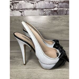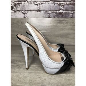 Selling miu miu Great Labels White Patent Leather Black Bow Peep Toe Slingback Stiletto High Heels Women Sz 37EU/6.5M US