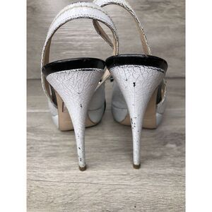 Selling miu miu Great Labels White Patent Leather Black Bow Peep Toe Slingback Stiletto High Heels Women Sz 37EU/6.5M US