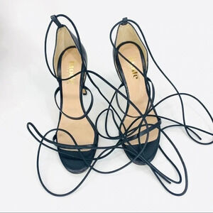 Size 39. Great condition. Comes with 79” leather cord to tie as a Greek sandal style! Barely there stiletto heels with light snake embossing. Could also use a silk or other ribbon to tie up the leg.