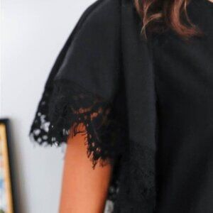 modern Black Lace Trim Detail Flowy Short Puff Sleeve Top