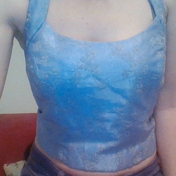 morgan co bridal top beautiful purple with flowers to make u look amazing belly top that ties in back no tears has all original tags never been worn but no original price tag on it l
