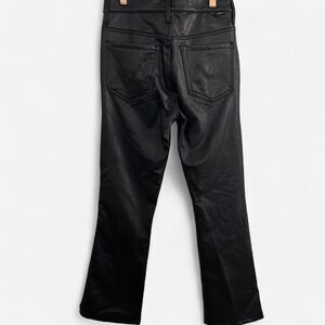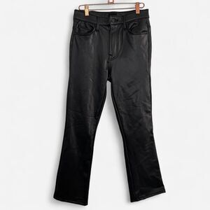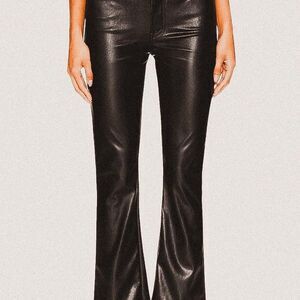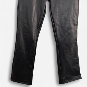 65% polyurethane, 15% viscose, 10% poly, 10% elastane. Dry clean only. Faux leather fabric. Zip fly with button closure. 5-pocket design. 13" at the knee breaks to 15" at the leg opening.