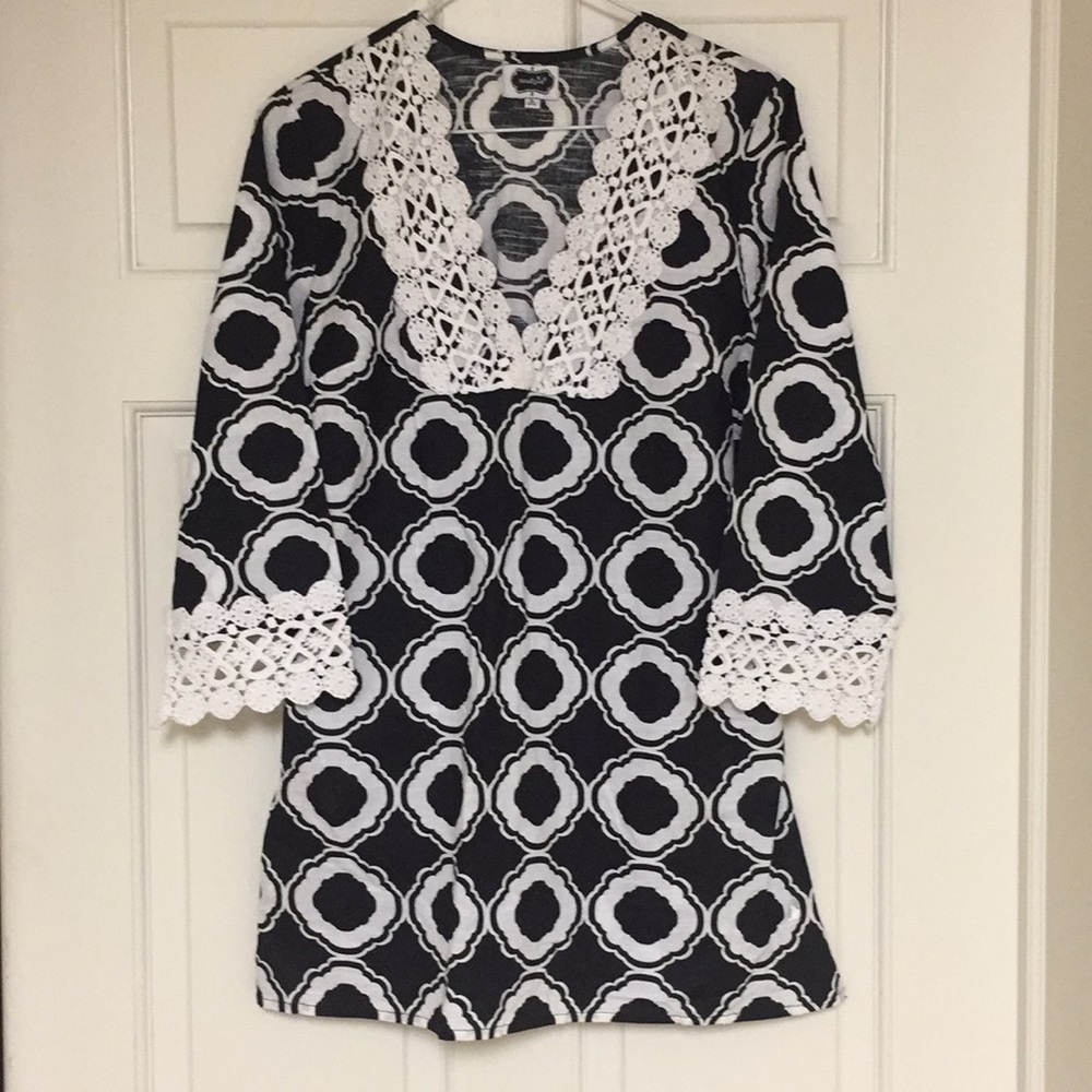 Adorable cotton tunic with larger black and white print. Could be worn as a bathing suit cover up or would look great with white skinny jeans. NWOT