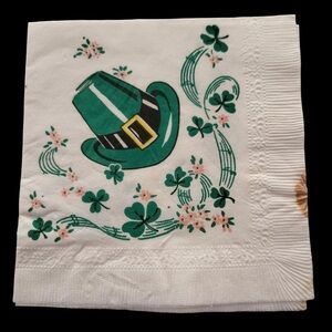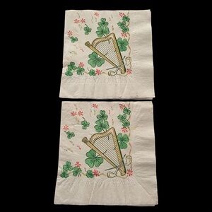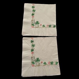 Celebrate St. Patrick's Day with these charming vintage paper napkins featuring clovers, a harp, a leprechaun, and a dog. Perfect for adding a touch of Irish cheer to your party.