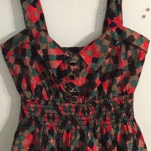 fun multi colored dress (olive green, brown, green, orange and mauve), with elastic ruching at the waist and black buttons at the top. hits between the knee and mid thigh