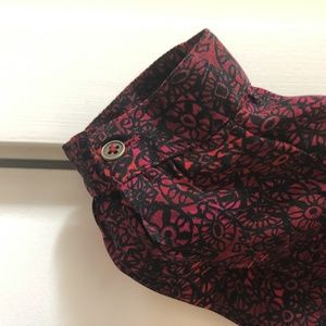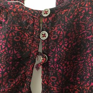 This eggplant colored blouse has beautiful opening details on the décolletage and in the back. Flirty and professional. Three buttons close at the back of neck. The blouse hangs loose and comes up high on neck. The back is open to about half-way down the back. Great top for work. Wear it over a black strapless dress or with slacks. The details are the best part of this item.