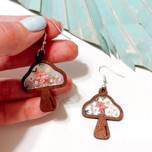 Wooden mushroom dangle earrings in silver tone hardware