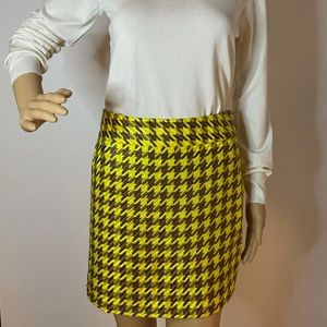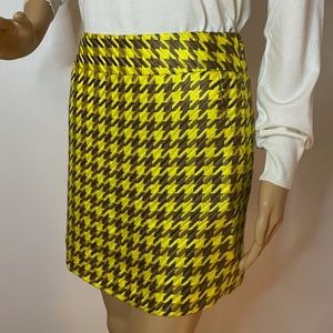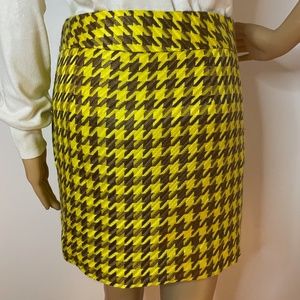 The Limited yellow and brown houndstooth fitted mini skirt. This skirt has pockets on the sides and zips up from the side. This is a timeless pattern with bright colors, the mustard yellow is very “Clueless” and has 90’s schoolgirl vibes. It can be muted by pairing it with neutral colors.. super trendy but classic and fabulous! Outshell- 100% acrylic lining- 100% polyester. Measurements- LAID FLAT