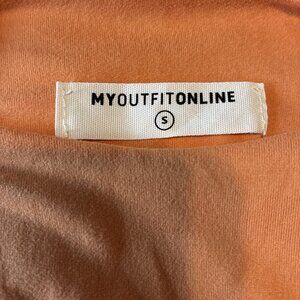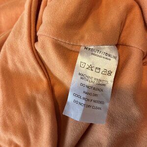 The product is a solid orange crew neck fitted knit short sleeve t-shirt in size small from the brand My Outfit Online. It is designed for women and made from a knit fabric type. The t-shirt features a regular size type, short sleeves, and a crew neckline, providing a comfortable and stylish option for casual wear.