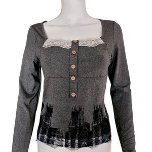 stretchy lace-trim babydoll top. i hand-printed a cathedral going around the waist and a gothic cross on the back. wash cold hang dry