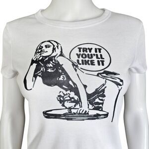 pinup graphic printed by me on a brand-new bella canvas baby tee. hg-inspired ofc. i can also print this (or any of my designs) on a long-sleeve tee/cami; message for details :)