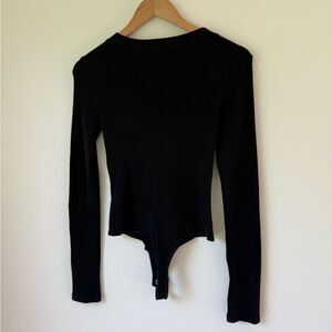 The Monty Bodysuit by n: PHILANTHROPY in Black Cat. Exposed front snap button closure. Bottom snap button closure. Waffle knit fabric. Long sleeves. Preowned with some pilling as pictured.