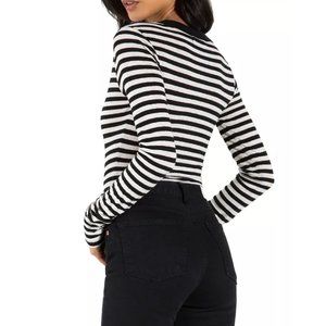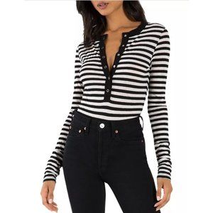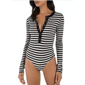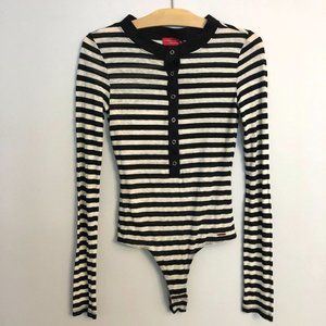 Lightweight bodysuit with partial front snap button placket. Thong back with snap closure. Semi-sheer. Hand sewn plaque on left hem. No inside care tag. Info as follows: 55% poly, 25% linen, 20% cotton. Wash cold delicate, like colors. Lay flat to dry. NWT.