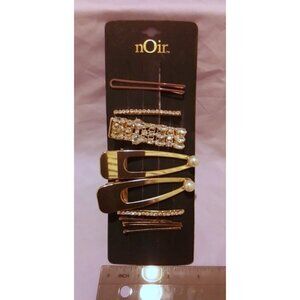 Featuring an elegant collection of 10 hair clips, this set by nOir combines various gold tone, faux pearl, and rhinestone designs. Ideal for adding a sophisticated touch to hairstyles.