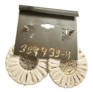 Stunning statement earrings featuring natural cream raffia arranged in a fan design with gold-tone metal medallion centers. The top studs have a beautiful textured beaded design.