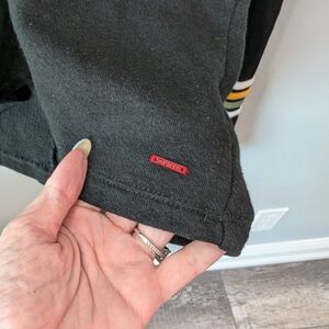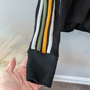 Embrace comfort and style with this black oversized hoodie from n:PHILANTHROPY. Featuring long sleeves and a relaxed fit, this top is perfect for casual wear. The white drawstrings and subtle decorative stripes add a touch of flair to this cozy sweatshirt. has Terry cloth like fabric on inside. in good used condition. has raw edges. measurement in photos.