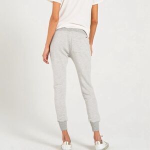 French terry deconstructed sweat pant. Contrast rib waistband with elastic and functional drawstring. Front zipper pockets. Hand deconstruction on front legs. Back patch pocket. Hand sewn metal plaque on wearers' right back under waistband. Very soft.