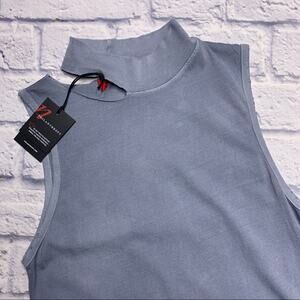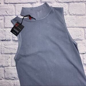 Features a mock turtleneck with a cut out at the base, sleeveless. A line silhouette with a distressed hem. Unlined. Made in the USA