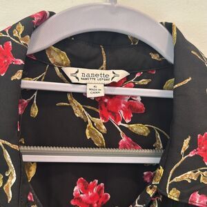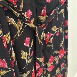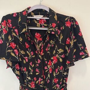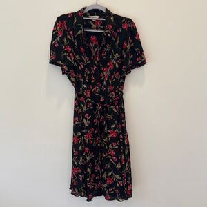 Chic black midi dress with striking red floral print. Ideal for versatile styling.