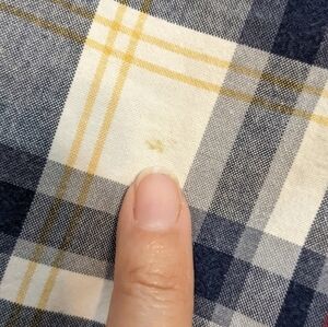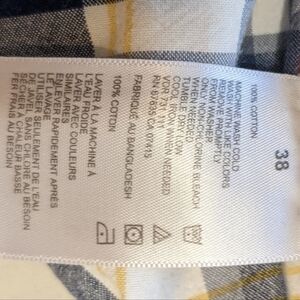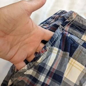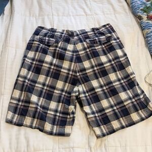 Nautica 100% cotton plaid shorts with 2 front pockets and 2 back pockets. button and zipper closure. there is a small spot on the back of the shorts that may come out of spot treated but I am not positive. Fun plaid pattern of white and blue, white red and yellow/gold.