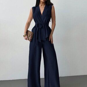 navy blue Elegant Women's Surplice Sleeveless Belted Blouse & Wide leg Pant Set