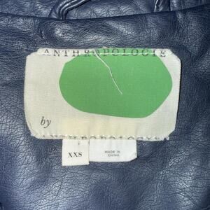 Navy blue faux leather Anthropologie moto jacket with zipper detailing. Tagged XXS but could work for XS-S as well. For reference I’m a M and could just baaarely zip closed😅. See picture 4 for true color!
