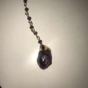 dark purple stone on end, hangs to about middle of chest.