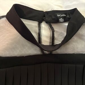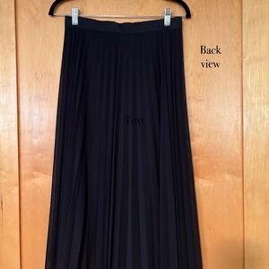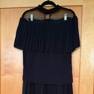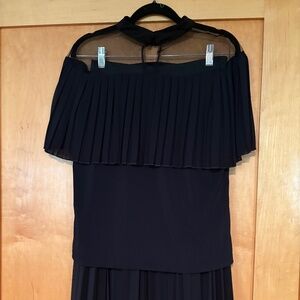 a black pleated skirt with an elastic waistband with an underlay. Great conditionl. Size large. The top was bought separately but it matches the skirt perfectly. It has the same pleat with a sheer top. The top is a medium.