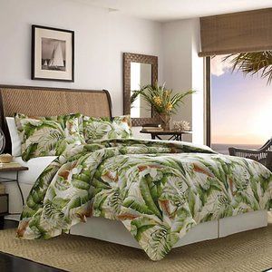 brand new 3-piece Tommy Bahama Palmiers QUEEN Duvet Cover Set in a tropical leaf print that reverses to a lattice pattern. The label on the package states: "Reverses to complementary lattice pattern. 100% Cotton. 230 Thread Count. Duvet Cover is 88 inches x 92 inches. Each Standard Pillow Sham is 20 inches x 26 inches. Duvet Cover features a button closure. Additional inner corner ties help keep the duvet in place. Shams feature an overlap closure. Machine washable in cold water. Tumble dry low.” Brand new, factory-folded in unopened, undamaged, original retail packaging ... UPC 883893535350.