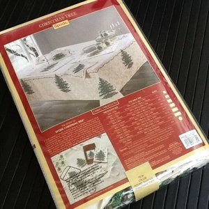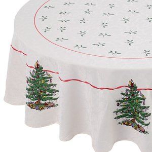 brand new 70-inch Round Spode Whimsical Christmas Tree Damask Fabric Tablecloth. Seats 4 to 6. Iconic whimsical tree with a playful Santa on an ivory (not white), woven damask fabric and has a Red Ribbony Line (they call it "Red Trim") around the perimeter. This 58% Cotton and 42% Polyester Fabric Tablecloth is machine washable. Condition is brand new, factory-folded in unopened, undamaged, original retail packaging.
