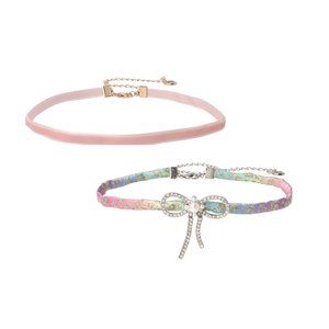 LUV Betsey Bow Choker Necklace Set - Unique choker necklace set featuring one multi-colored printed fabric choker with chic bow charm adorned with glistening crystal stones and pearls, and second pink velvet ribbon choker. This colorful set includes 2 individual chokers to mix and match, set in gold-tone metal with adjustable lobster clasp closures. MATERIAL: Set in gold-tone metal with glass stones and fabric. DIMENSIONS: 14.5" + 6" Extender Length, Choker Width: 0.25", Bow Charm Drop: 1.5". CLASP TYPE: Lobster Clasp.