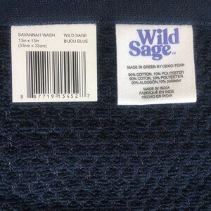 3-piece Set of Wild Sage™ Savannah Quick Dry 90% Cotton 10% Polyester Towels in Bijou Blue color ... designed as an ever-so-slightly splotchy dark blue ... NOT exactly a Navy hue. Bath towel is approximately 30 x 54 inches. Hand towel is approximately 16 x 28 inches. Washcloth is approximately 13 x 13 inches. Machine washable. Condition is brand new with original retail tags.