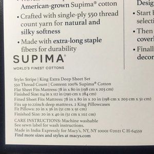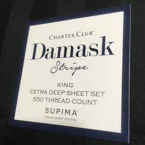 brand new Charter Club DAMASK 550 Thread Count 100% Supima Cotton 1.5 inch Stripe KING EXTRA DEEP Sheet Set ... King Flat Sheet, King Extra-Deep Fitted Sheet, and 2 King Pillowcases. The manufacturer's name for the color is Black and the sheet set is striped. The label on the package states: "King Flat Sheet finished size is 114 inches x 110 inches. King Extra-Deep Fitted Sheet is 78 inches x 80 inches and fits mattresses up to 22 inches deep. Each King Pillowcase is 20 inches x 40 inches. Machine washable."