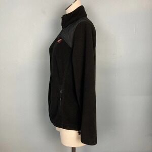 New Balance Women's Full Zip Fleece Jacket Quilted Yoke Rose Gold Logo Size M. Constructed of premium micro fleece for all weather comfort. Anti pilling. Rose Gold New Balance logo on front left chest under quilted overlay fabric for extra warmth without weight. Zippered pockets in front. Drawstring with slide adjuster at bottom hem. 100% polyester. Machine wash, tumble dry low. In good, pre-owned condition. Small area of wear on right sleeve circled in red in the photos. Measurements taken flat: pit to pit: 20", sleeve length: 24", shoulder to hem length: 25.5".