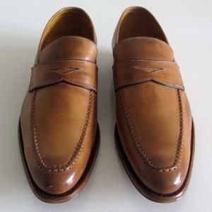 Men's CANALI dress penny loafers with shiny Italian leather upper, pointed moc toe, penny strap along vamp, tonal top stitching, leather lining, lightly padded leather insole, leather sole and heel with black rubber insert and handed a nails. Color: Tan with darker tone-on-tone nuances. Size: 46 ( Canali ) Or 13 ( US ). Made In Italy. Condition: New ( never worn outside, tried on a few times only ).