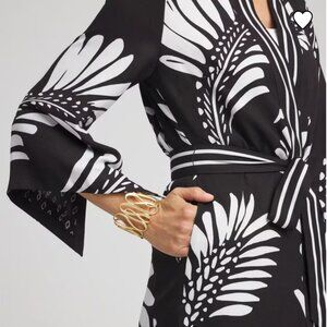 Ultra-sleek black and white long kimono—length hits above the knee. Showcasing a palm print with a striped border trim, side-slits, and a self-tie belt. Silky soft fabrication helps define this new iteration of our bestselling kimono silhouette. The perfect topper—for casual ensembles such as jeggings and a microfiber tank or for over your bathing suit—‚or wear over trousers and a tee for more upscale plans.