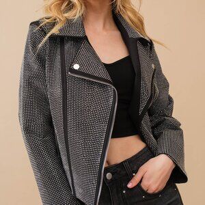 Its stretchy fabric ensures a comfortable and flattering fit, while the crystal studded detailing brings a bold and unique element to the classic moto jacket design.