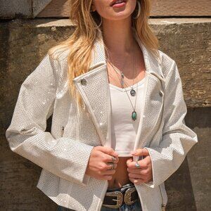 The Crystal Studded Stretch Zip Up Moto Jacket is a stunning and edgy fashion statement that adds a touch of glam to your wardrobe.