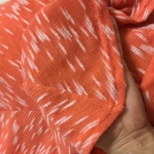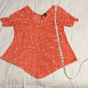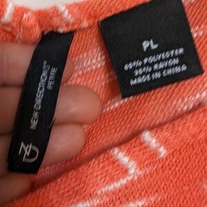 new directions lightweight sweater top size petite large. this top is so cute with the design angling towards the front and back seam which is flattering to the figure. in great condition. the color is a salmon or coral color and the white is white