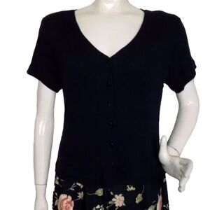 Navy Blue cotton upper with a ribbed texture, V-neck, short sleeves, and cloth covered buttons.