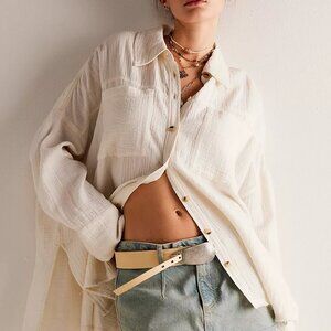 The perfect billowy buttondown from our We The Free collection featured in a gauzy fabrication and relaxed fit with a collared neckline and cuffed sleeves.