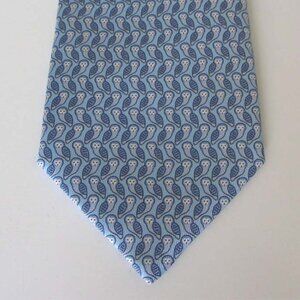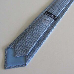 Men's HERMES classic neck tie ( Style: 605841 IA ) featuring a pointed tip, an adjustable fit and geometric owls pattern throughout on light blue background. Color: light blue, white & grey. Fabric: 100% Silk. Made In France. Condition: New without tag.