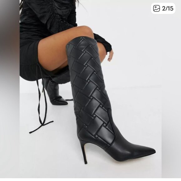 Black Quilted BICKLEY Tall Knee High Leg Stiletto Boots. size 40. The brand's signature patchwork-quilting motif brings eye-catching texture to a tall boot styled with a dramatically pointed toe and stiletto heel. Shipped with USPS priority mail.
