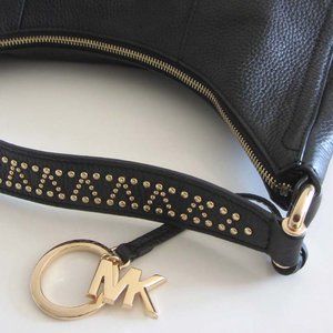 Beautiful black pebble leather MICHAEL KORS ( Style: Lydia ) hobo / shoulder bag with gold studded strap, gold tone hardware, curved top handle and top zip closure. Interior of bag: 1 zipper pocket and 5 slip pockets. Exterior: Back snap button pocket. Approximate measurements: 8" handle drop, 13 1/2" L (measured @ middle) x 9" H x 4" D. Condition: New without tag.