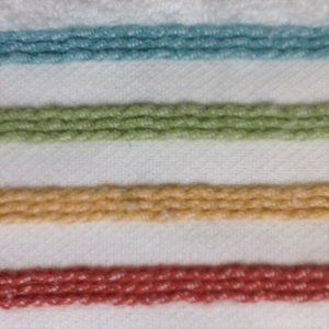 one brand new Saturday Knight Limited "Paradise Beach" Bath Towel embroidered with a beachy Sign Post, two multi-colored Surfboards, and a green Palm Tree ... along with 4 parallel lines of textured raised stitching in aqua, green, yellow, and coral colors. Expertly woven of 100% Cotton, this seaside-themed towel is highly absorbent. Condition is brand new with original retail tags ... UPC 036326576769.